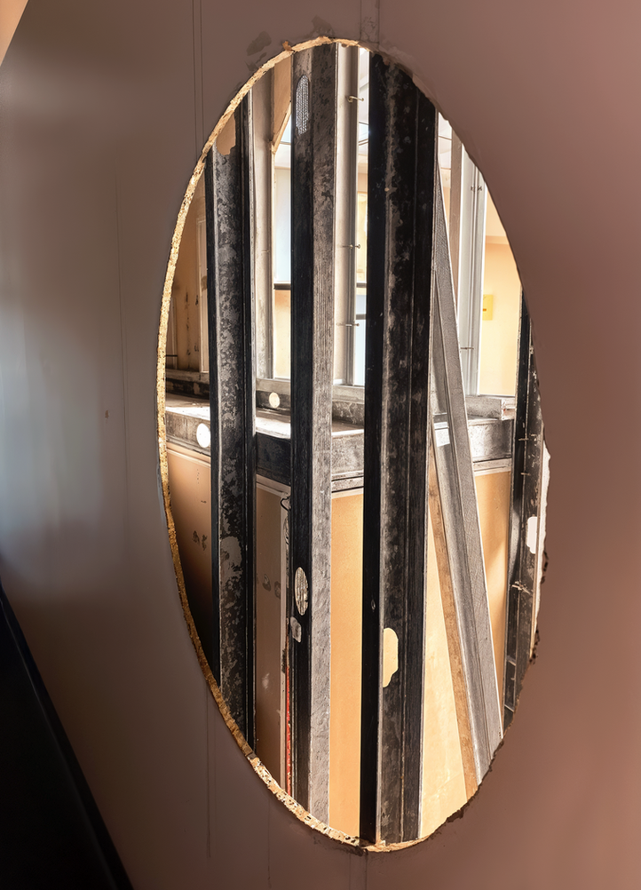 The Prince Street wall cut treats the building as a skull that needs trepanation. A precise circular opening is scraped through paint, plaster, and gypsum until the metal bones of the office appear. The operation is slow and surgical: a nail at the center, a cord acting as compass, a ring of drill holes, then the bite of the keysaw. Each layer lifted away is a small exorcism, a release of whatever has been stored in the walls.