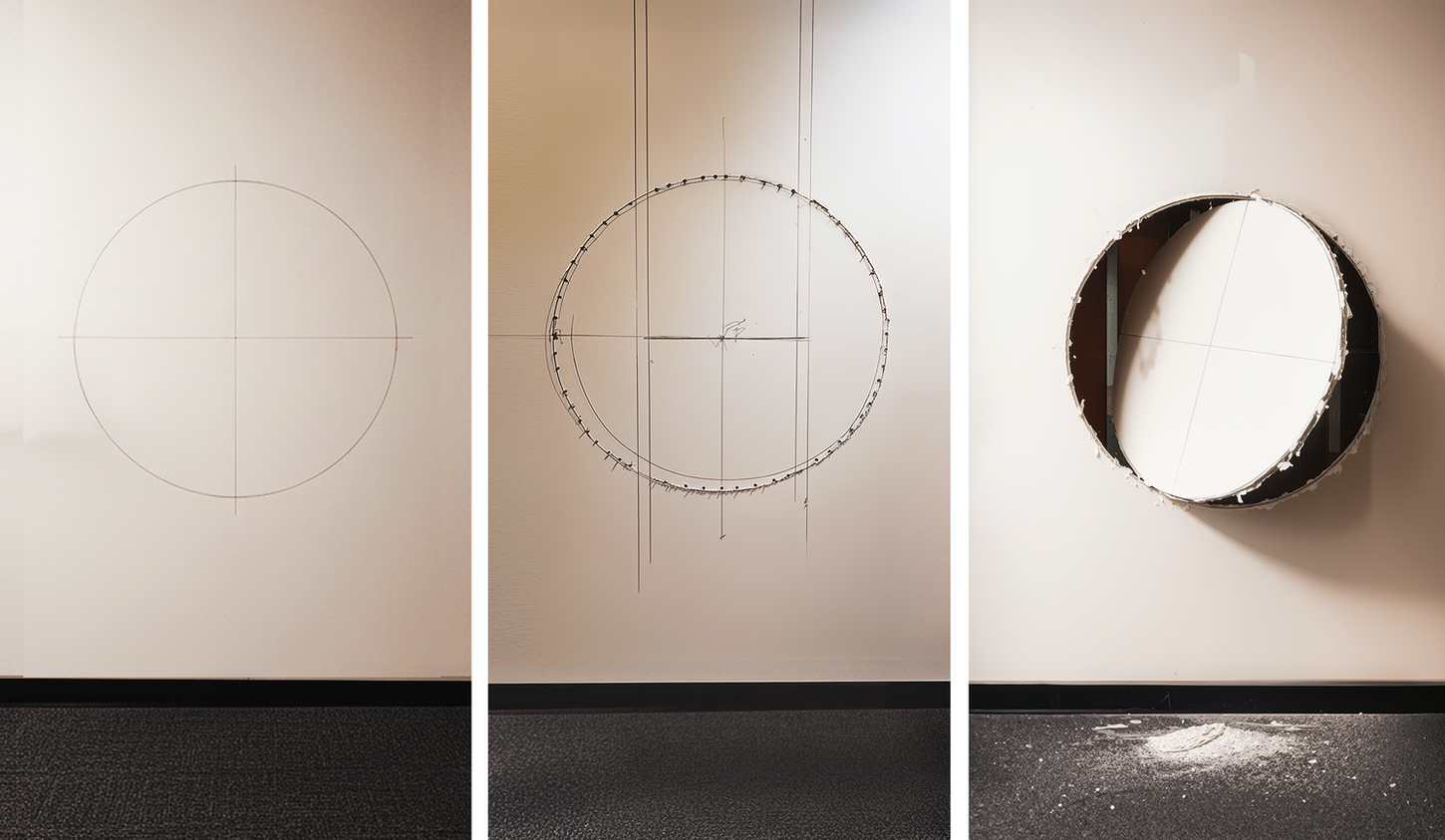 Conical wall cut passing through multiple rooms: compass-drawn circles, dense ring of drill holes, keysaw excision through gypsum board and metal studs; floor and ceiling layers peeled back to form a slanted light cone.